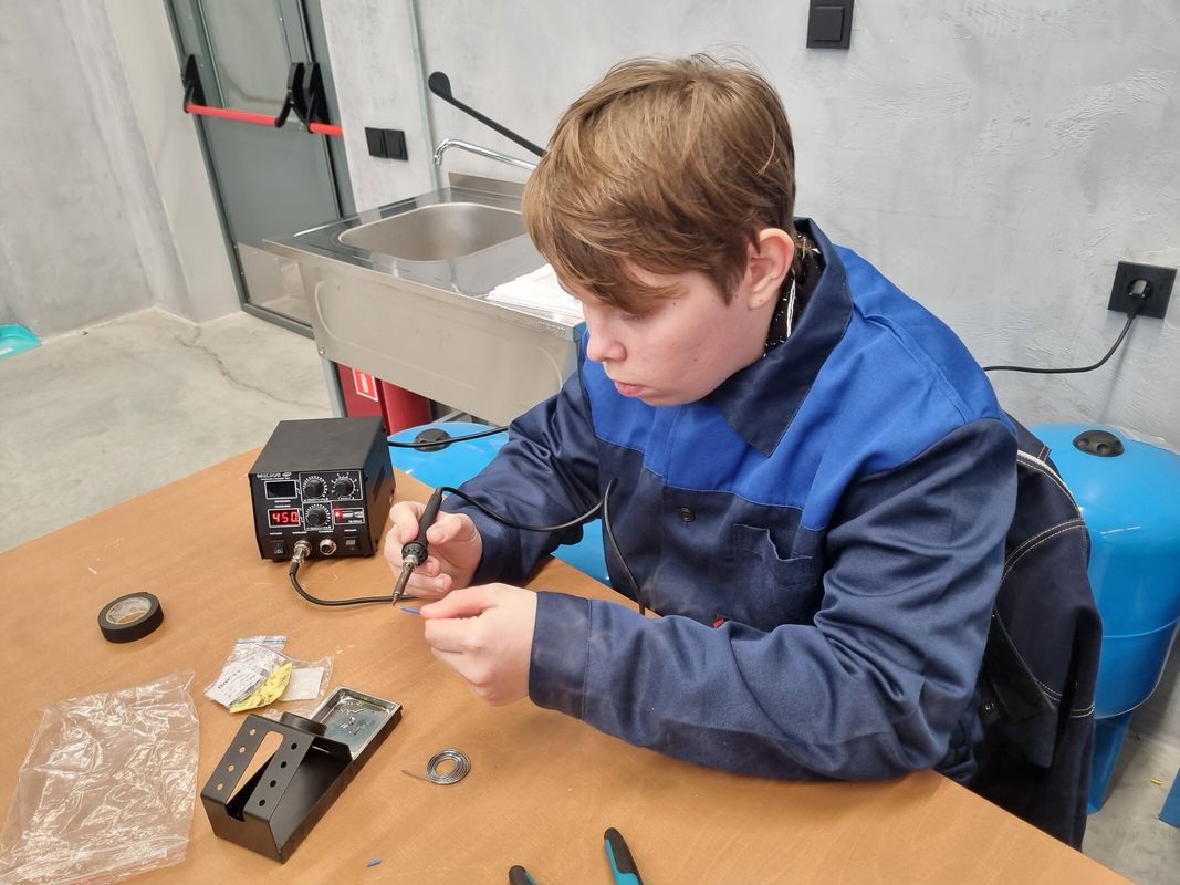 На пробе наставник наглядно продемонстрировал процесс подготовки проводов, резистора и светодиода, процесс выполнения работы и полученный результат. После проведенного инструктажа восьмиклассники ознакомились с заданием и приступили к его выполнению: зачистили концы трех многожильных проводов от изоляции, спаяли их между собой, с помощью мультиметра проверили электропитание на рабочем месте, проверили полярность светодиода; по схеме припаяли резистор со светодиодом и подключили к электропитанию. С помощью наставника проверили правильность выполнения работы.