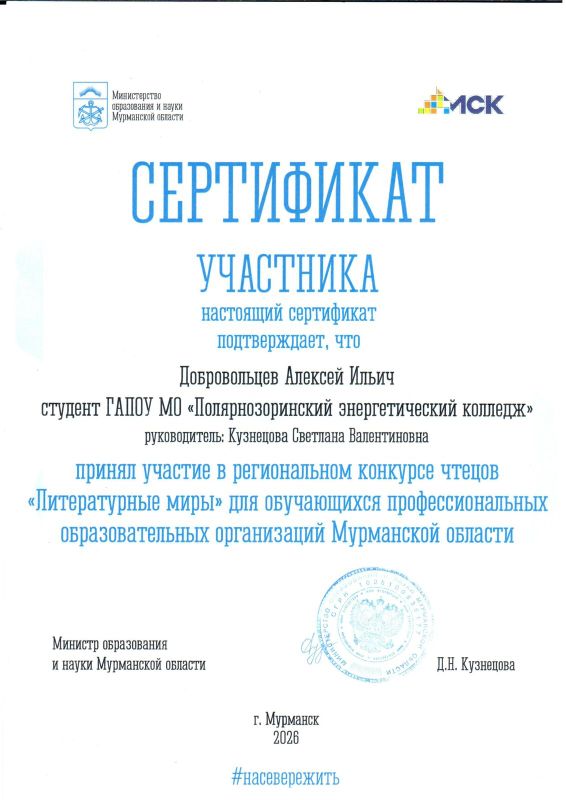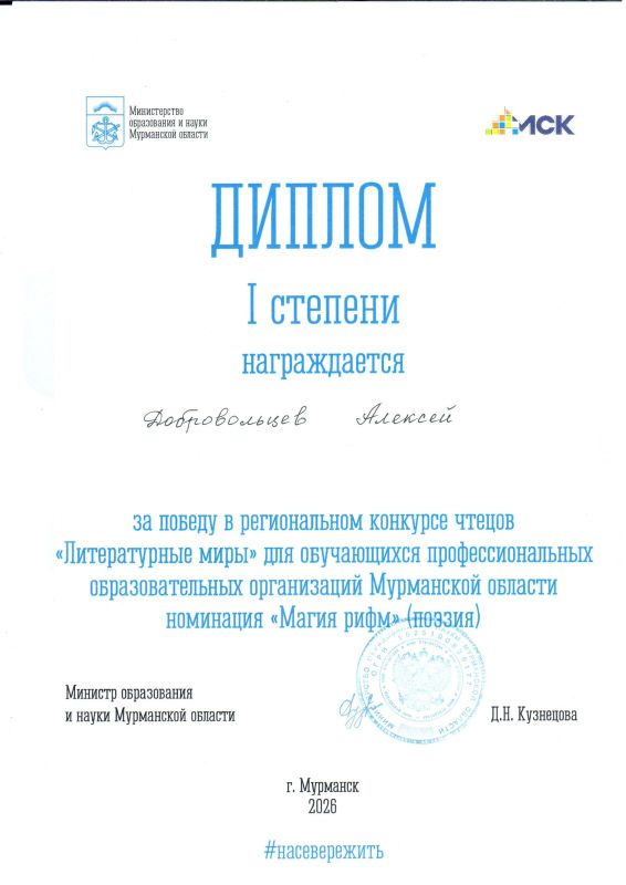 8 (81532) 7-57-12; 7-11-67 23 марта 2026 г. на базе колледжа ГАПОУ МО «Мурманский строительный колледж имени Н.Е. Момота», в рамках реализации Федерального проекта «Профессионалитет» Национального проекта «Молодежь и дети» прошел региональный конкурс чтецов «Литературные миры», посвященный Году единства народов России. В конкурсе принял участие 21 студент из разных колледжей Мурманской области. Наш колледж представлял студент группы СП 1 Добровольцев Алексей. Конкурс проводится в двух номинациях: